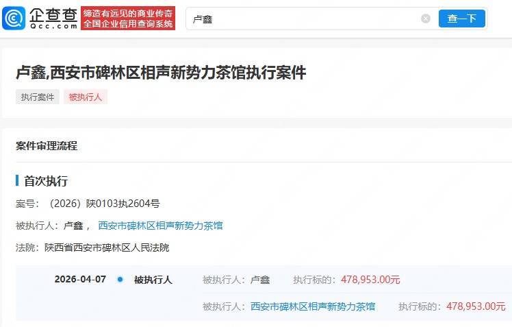 据企查查APP显示,近日,相声演员卢鑫及其名下西安市碑林区相声新势力茶馆新增一则被执行人信息,执行标的47.8万余元,执行法院为西安市碑林区人民法院。