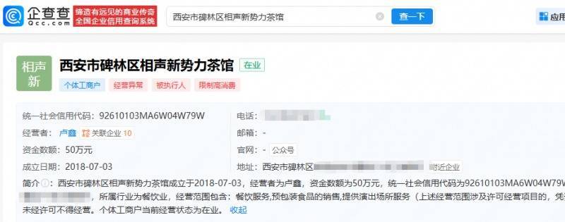 资料显示,西安市碑林区相声新势力茶馆成立于2018年7月,经营者为卢鑫,经营范围为餐饮服务、预包装食品的销售、提供演出场所服务。