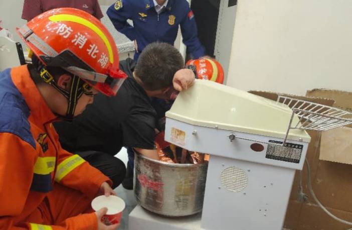 消防员到达现场时,发现一名男子正坐在椅子上,身体前倾趴伏在和面机的料桶上,左手勉强支撑着身体,右手手掌则被和面机内部“S”形搅拌钩牢牢卡住,伤口流血不止。男子表情痛苦,但意识清醒。此时和面机已经断电,现场消防员一边安抚其情绪,一边仔细查看机器内部构造和手部被卡的具体位置,以便实施救援。